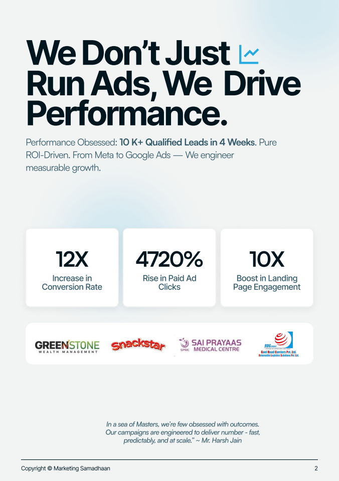 At Marketing Samadhaan, we don’t just “do marketing” — We build conversion-focused systems that bring in traffic, generate leads, and convert them into paying clients.